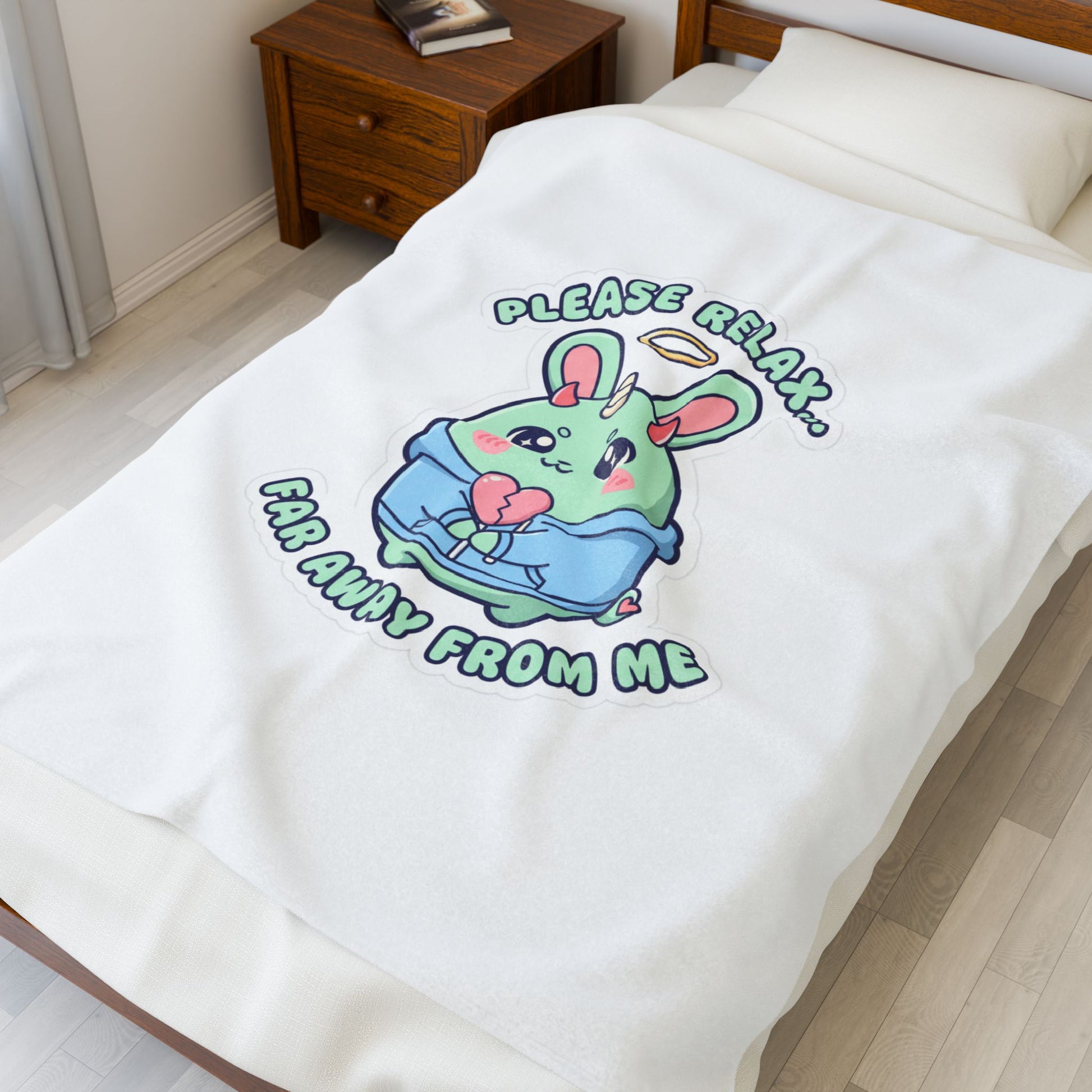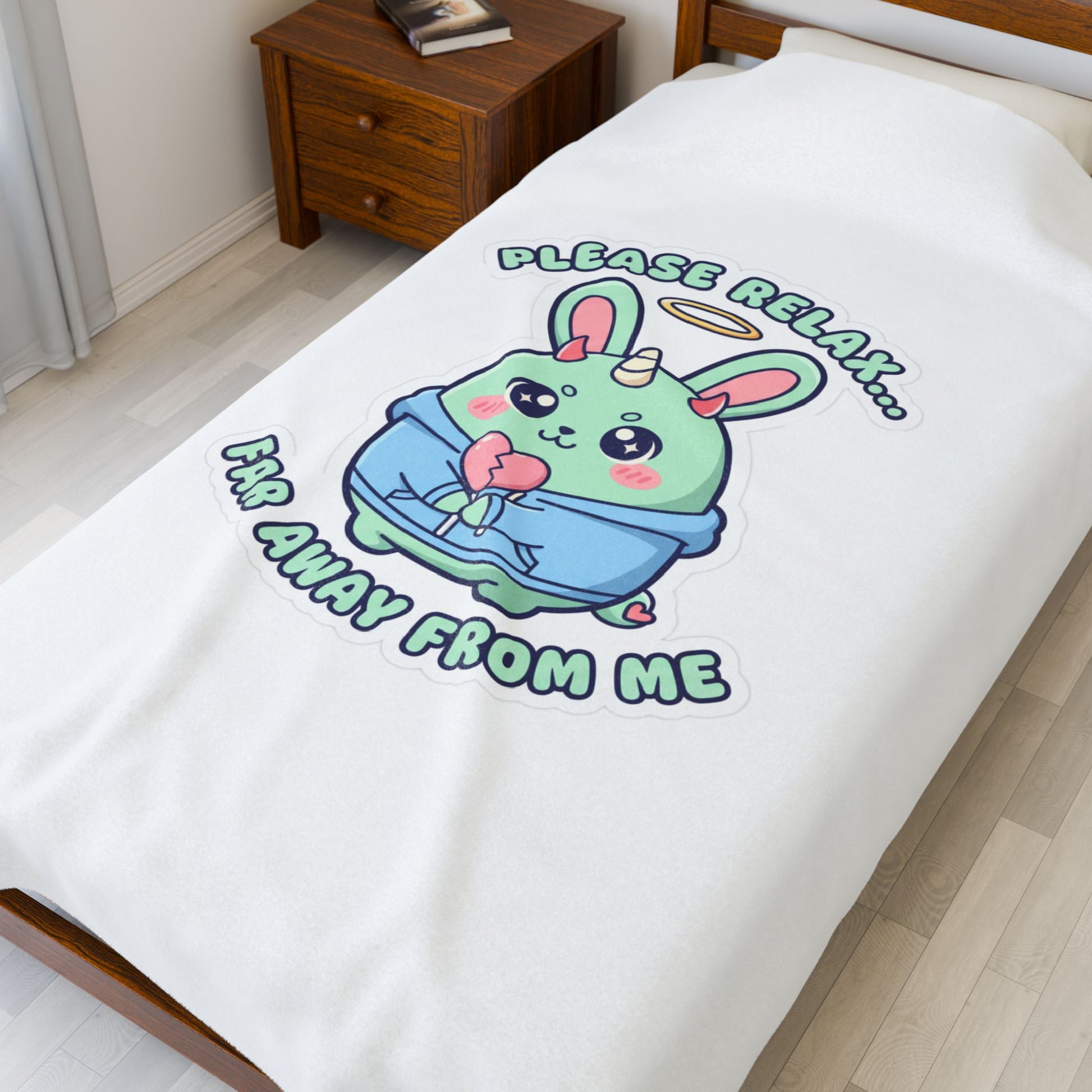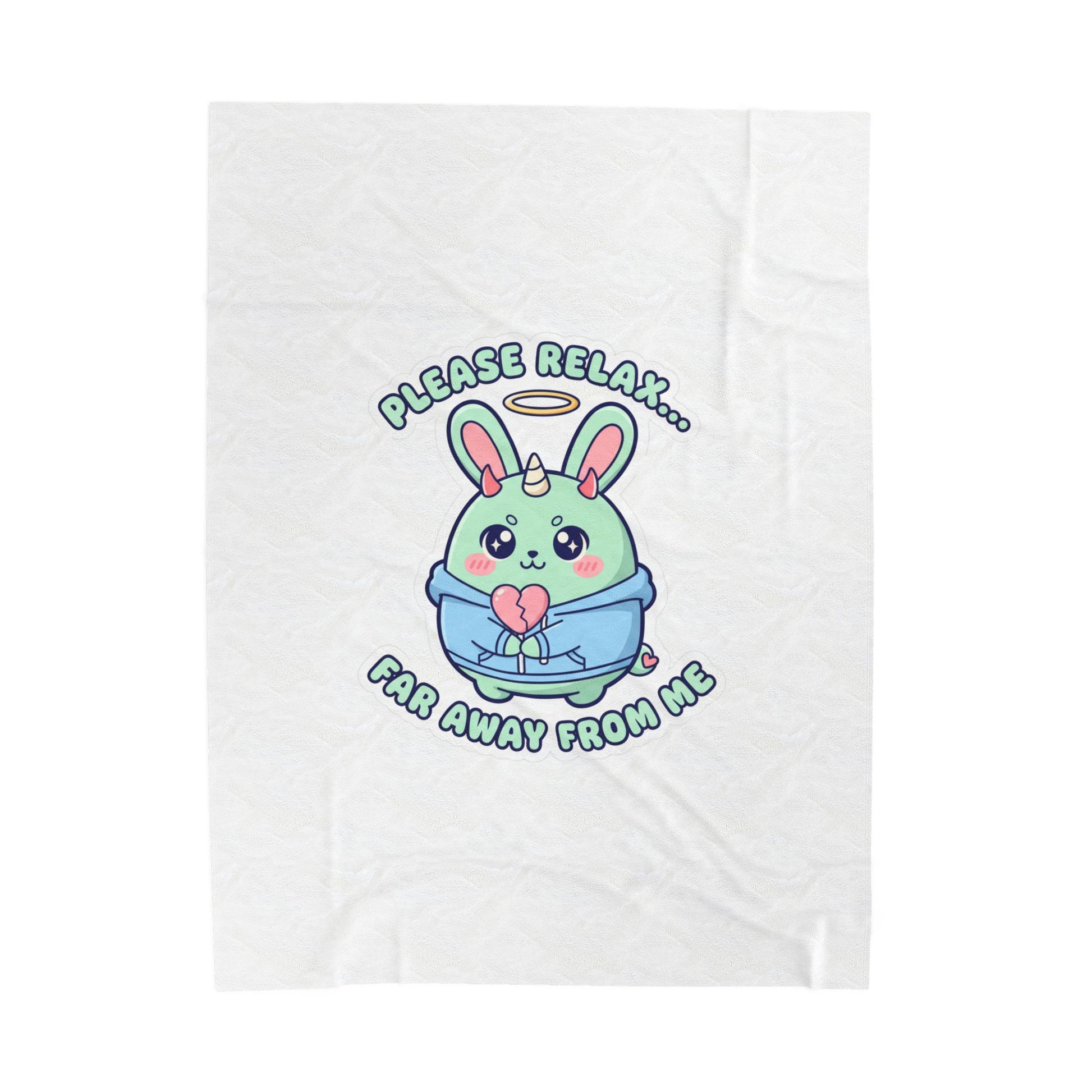 A plush, pastel-illustrated velveteen blanket featuring a kawaii bunny holding a heart with a playfully ominous caption—a soft-threat aesthetic that pairs saccharine visuals with gently assertive humor. The artwork uses mint, blush, and baby-blue tones with rounded, bouncy lettering to capture the cute-but-menacing vibe; printed on one side in high-detail, the blanket reads like a cozy personal statement for fans of kawaii and soft-grunge humor. Lightweight enough for daily lounging, it works as a comfort layer while adding a tongue-in-cheek touch to bedroom or chill spaces and photographs well for social feeds.