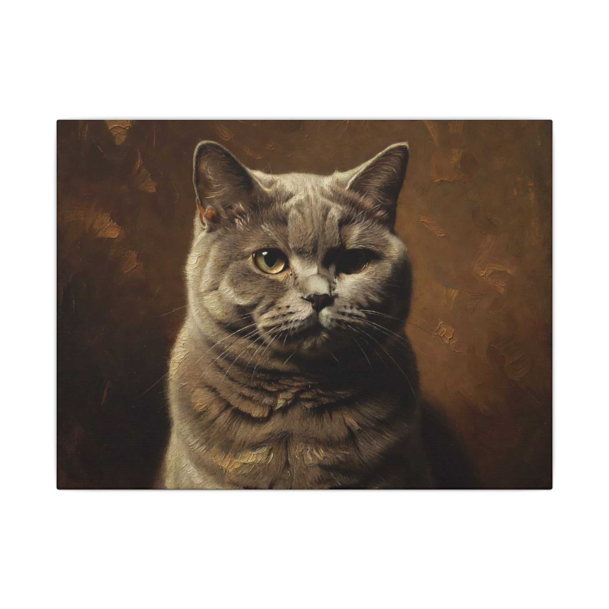A rich, painterly canvas print that brings quiet dignity and warmth to any room. This stretched matte canvas features a brooding, portrait-style cat rendered in deep, earthy tones—like a Victorian oil painting rediscovered in a cozy study. The texture and muted palette add an intimate, timeless mood that sits well above a mantel, beside a reading chair, or in a hallway where it can catch a slow, thoughtful glance. Sustainably built and printed with durable, non-toxic inks, the piece feels both classic and conscious—an artful companion for those who love subtle character and calm interiors.